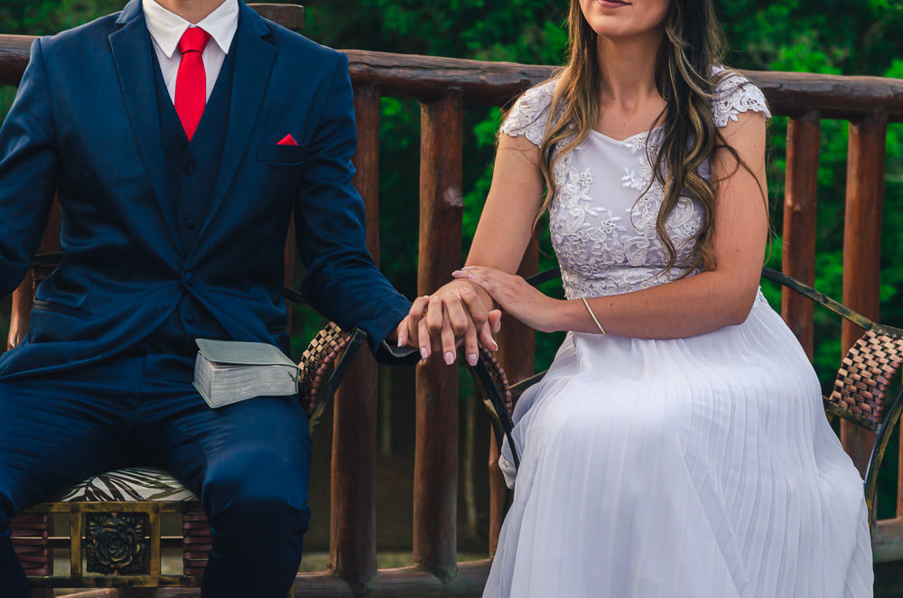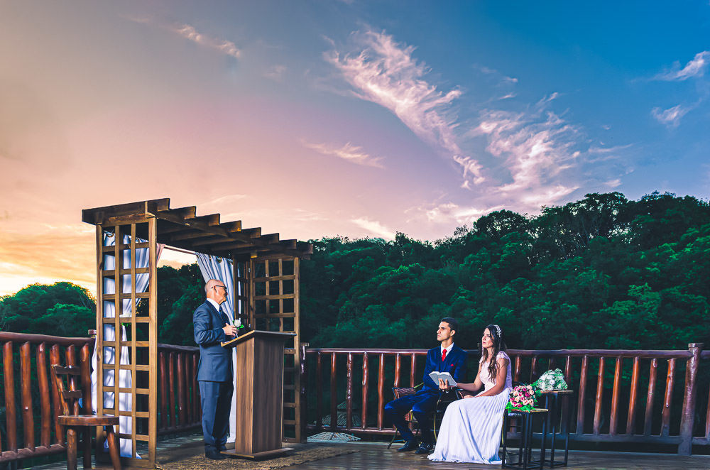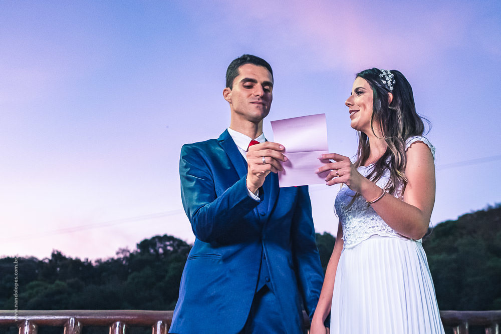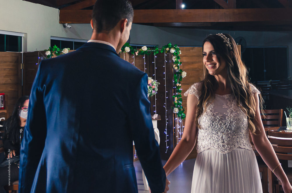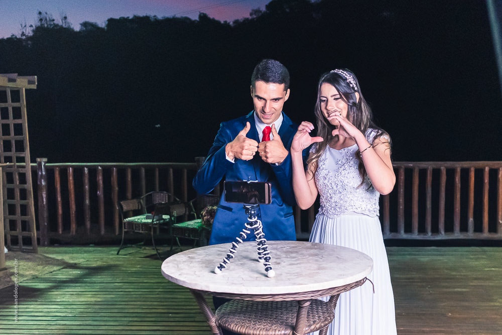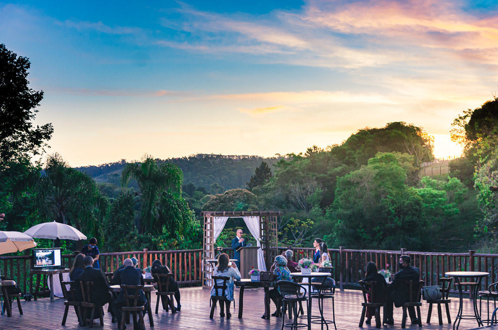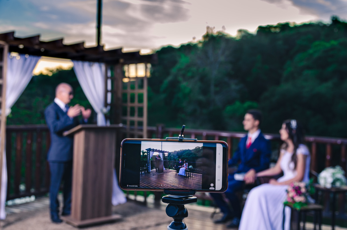 A quantidade de convidados presenciais foi bem reduzida, não devia ter 20 pessoas presentes. O local foi um Hotel Fazenda em Ibiúna, no interior de São Paulo, em uma área aberta e com amplo espaço, então, protocolos mantidos. E neste casamento tivemos um diferencial que gostei muito.