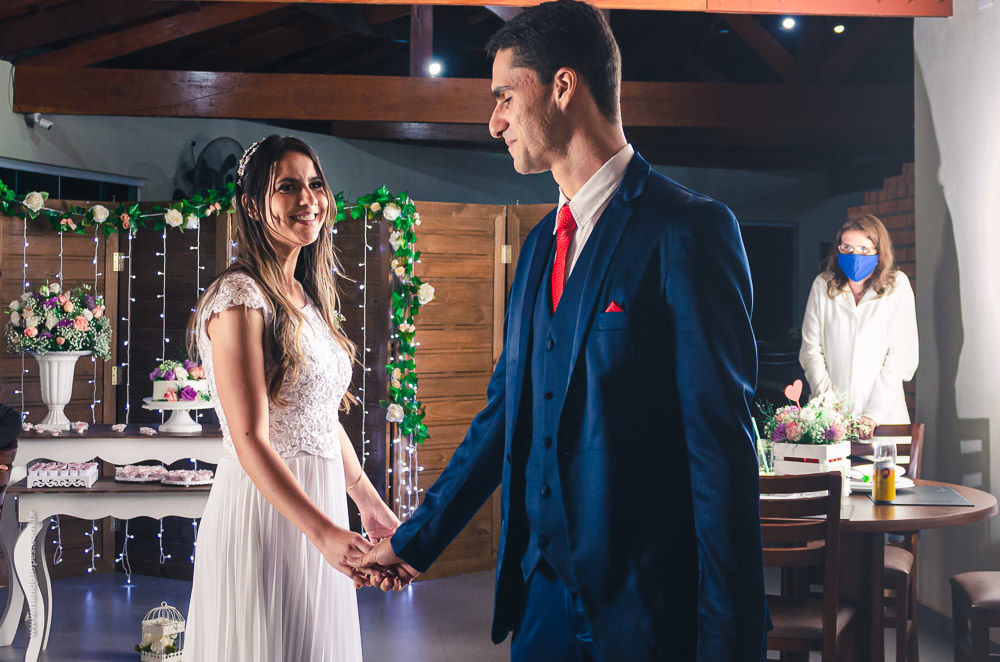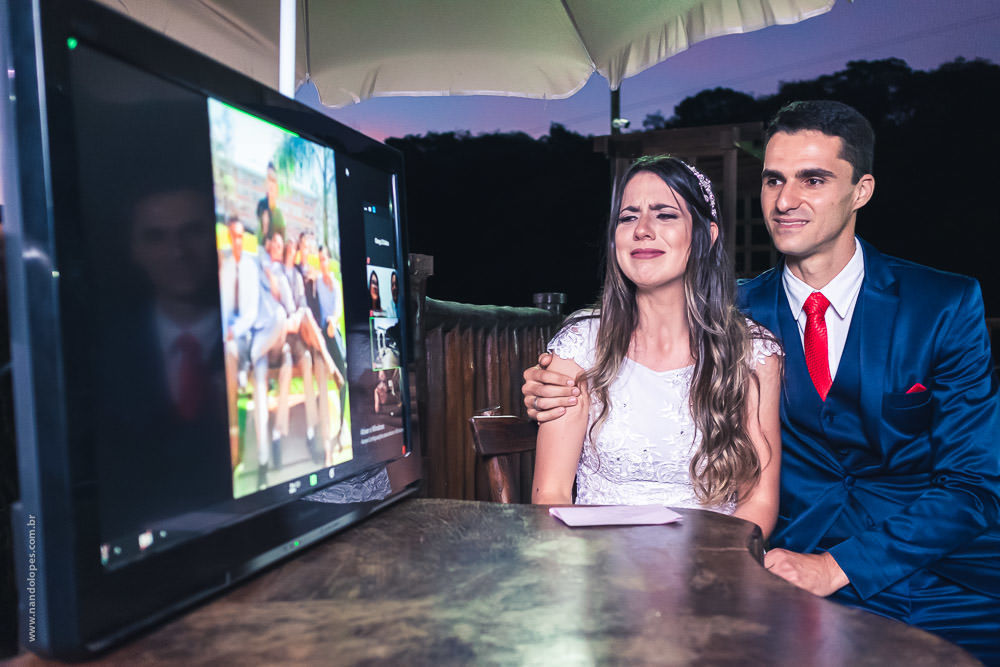A maioria dos convidados estavam assistindo on-line, pelo app de videoconferência Zoom. E foi muito emocionante, eles conseguiram ter uma cerimônia de casamento com muito mais convidados, todos seguros e todos felizes por dividir junto com o casal este dia tão feliz.